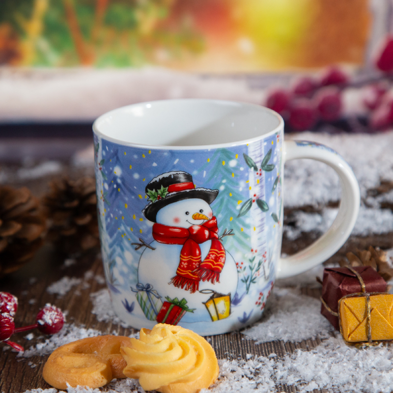 Коледна чаша 22033746 с вместимост 340 мл е идеален за празнични моменти у дома. Всяка чаша е изработена от порцелан и има уникален дизайн - едната изобразява усмихнат снежен човек, държащ фенер и подаръци, а другата - Дядо Коледа на фона на елхи, носещ подаръци. Ярките и весели мотиви добавят празнично настроение и чар на масата.