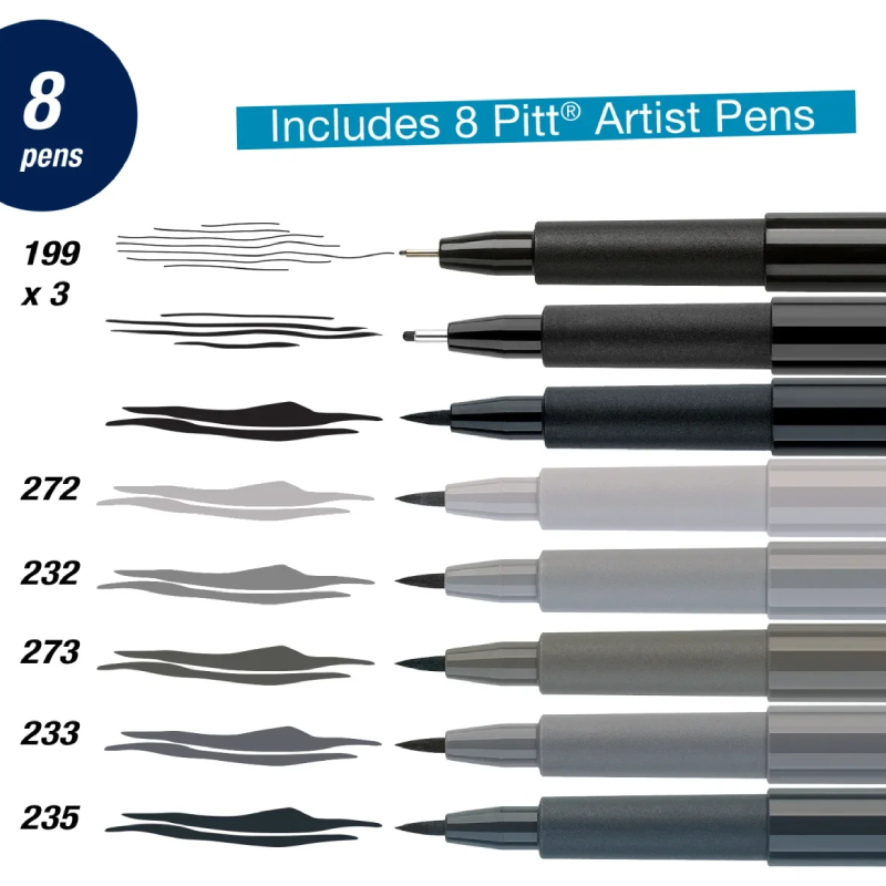 Комплектът маркери Pitt Artist Pen Manga от Faber-Castell е идеален за рисуване в стил Манга и комикси. Маркерите използват перманентно мастило, което е водоустойчиво, без мирис, с неутрално pH и без киселини, и не просмуква на другата страна на листа. Мастилото е пигментирано India ink, светлостойко и трайно на порести повърхности, подходящо за всички видове хартия и платно.