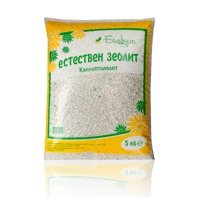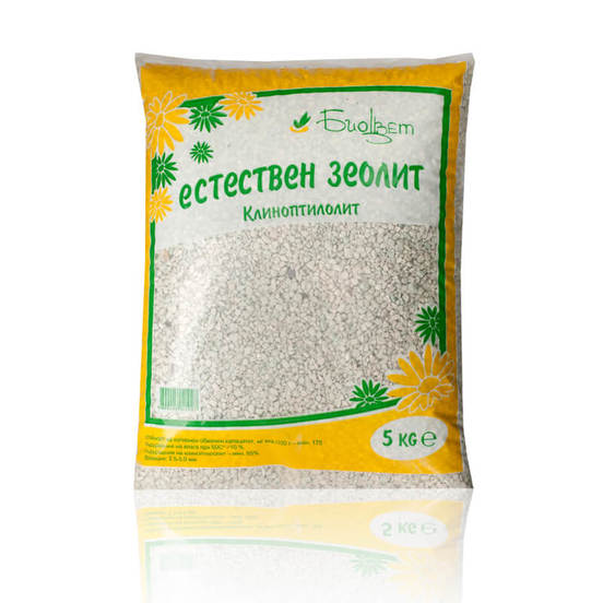 Минерален подобрител за почва Естествен зеолит на марката БИОЦВЕТ. Зеолитът, известен още като клиноптилолит, представлява изключително полезен минерал. Внесен в почвата, той подобрява влагосъдържанието в нея и абсорбира излишъка от амониев азот. Клиноптилолитът се използва като подобрител на почвите и почвените субстрати, при засаждане и пикиране на разсади и различни растения /включително декоративна иглолистна растителност/, плодни дървета и храсти, зеленчуци, зърнени култури, градински цветя, билки и други растения, тревни площи, за направата на професионални субстрати за оранжерийно производство, хидропонно отглеждане на растения. Използването на зеолит при засаждането на плодни или декоративни дървета и храсти оказва изключителен ефект върху растежа и спомага за по-бързото им вкореняване, а нарастването става почти два пъти по-бързо. Продуктът се предлага в разфасовка от 5кг.