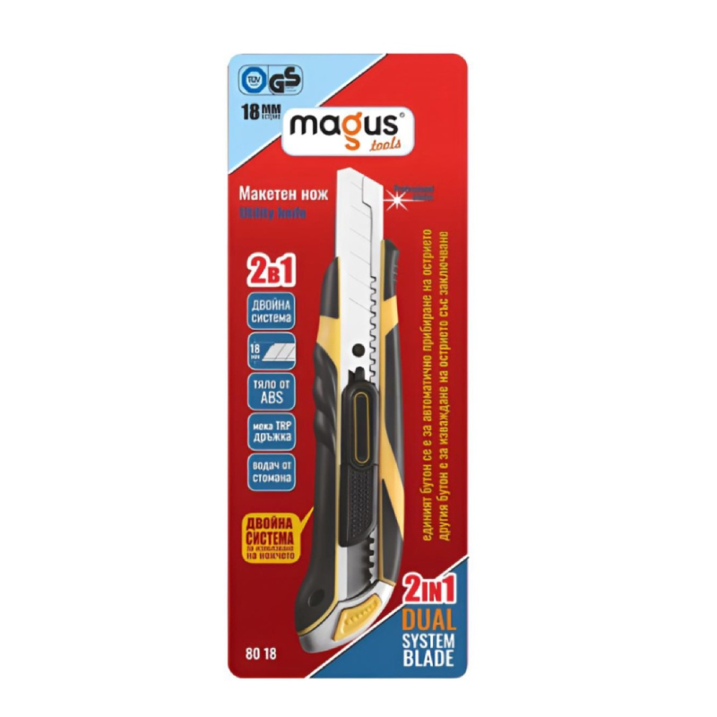 Макетен нож Магус с чупещо се острие 18 мм с дръжка от ABS + TRP за мекота. Разполага с водач от стомана за острието за по-голяма здравина. Има уникална двойна система 2 in 1 DUAL SYSTEM BLADE. Работи като фиксирано или прибиращо се в зависимост от желанието на потребителя. Осигурява точни разрези през гипсокартон, картон, уплътнители, силикони, гума и много други материали.