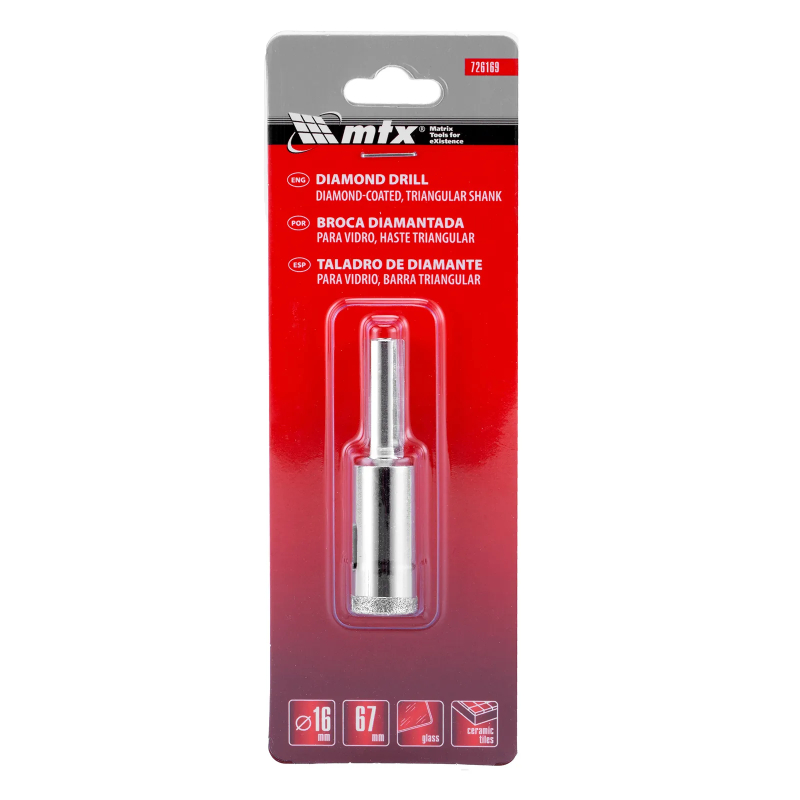 Боркорона диамантена за стъкло 16 x 67 мм на марката MTX. С 3-стенна опашка. Монтира се на бормашина или винтоверт и се използва за пробиване на стъкло и керамични плочки. За да се удължи живота на изделието, е необходимо да се използва водно охлаждане.