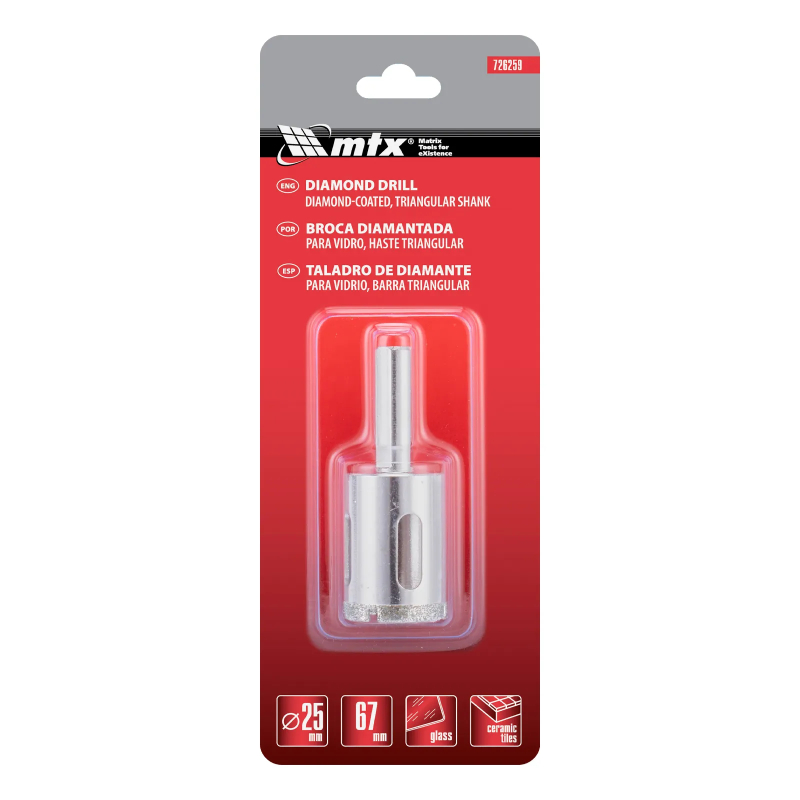 Боркорона диамантена за стъкло 25 x 67 мм на марката MTX. С 3-стенна опашка. Монтира се на бормашина или винтоверт и се използва за пробиване на стъкло и керамични плочки. За да се удължи живота на изделието, е необходимо да се използва водно охлаждане.