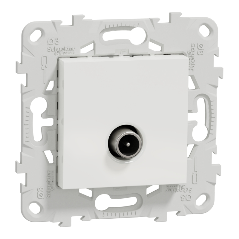 Телевизионната коаксиална розетка е предназначена за скрит монтаж и е съвместима с декоративни рамки от серията New Unica на Schneider Electric. Оборудвана с мъжки IEC конектор (9.52 мм) и затихване 1.5 dB, тя осигурява надеждно свързване към ТВ сигнал. Изработена от UV-стабилизиран термопластичен ABS, розетката е с IP20 защита, подходяща за вътрешна употреба. С компактни размери 74.5 x 74.5 x 35.5 мм и класически бял цвят, тя се вписва хармонично в съвременния интериор.
