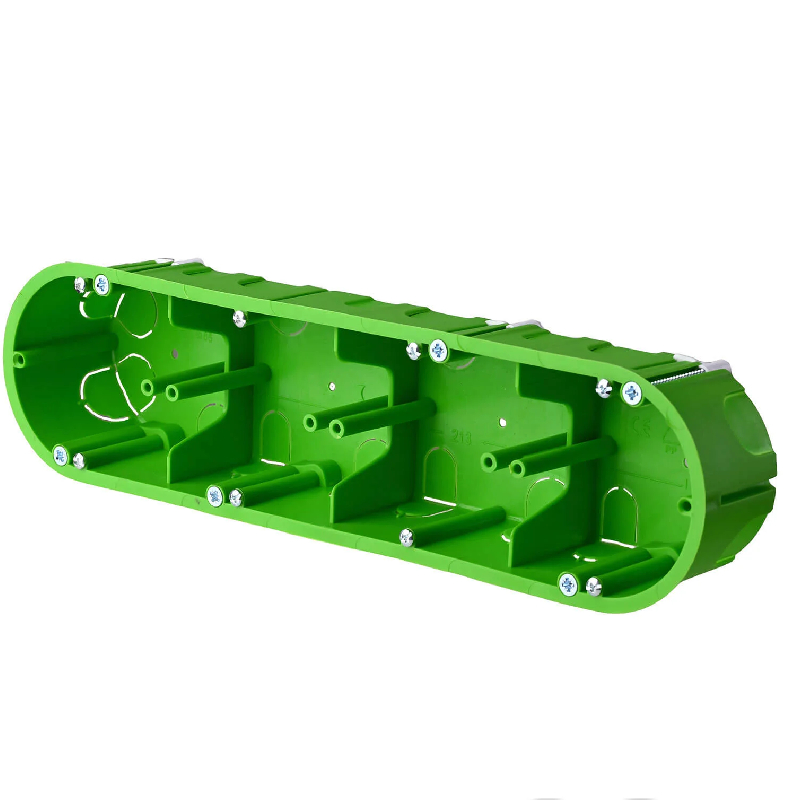 Практична и надеждна четворна конзолна кутия, предназначена за монтаж в гипсокартон. Подходяща за електрически инсталации в жилищни и търговски обекти, тя осигурява стабилна основа за контактни и ключови механизми.