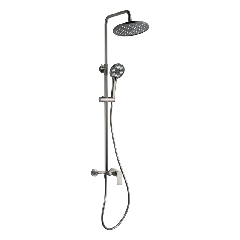 Сивото покритие в цвят Gun grey придава модерен и елегантен завършек, а регулируемата височина позволява адаптация според индивидуалните предпочитания. Изработена от качествен месинг, системата гарантира дълготрайна и надеждна употреба.