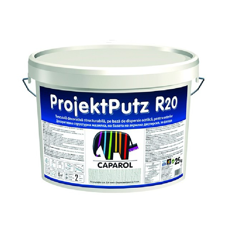Caparol ProjektPutz е висококачествена структурна акрилна мазилка, предназначена за външно приложение, която съчетава отлична паропропускливост, водоотблъскващи свойства и издръжливост на атмосферни влияния. Подходяща както за ново строителство, така и за реновиране на фасади, тя се използва като финишен слой в топлоизолационни системи (ETICS), гарантирайки не само функционалност, но и изключителна естетика.