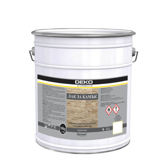 DEKO professional Лак за камък е висококачествен, безцветен гланцов лак, предназначен за финишна защита и естетическо подобрение на естествен камък, тухли и други порьозни строителни материали. Продуктът прониква дълбоко в основата, като защитава повърхността от проникване на влага, атмосферни влияния и пожълтяване с течение на времето.