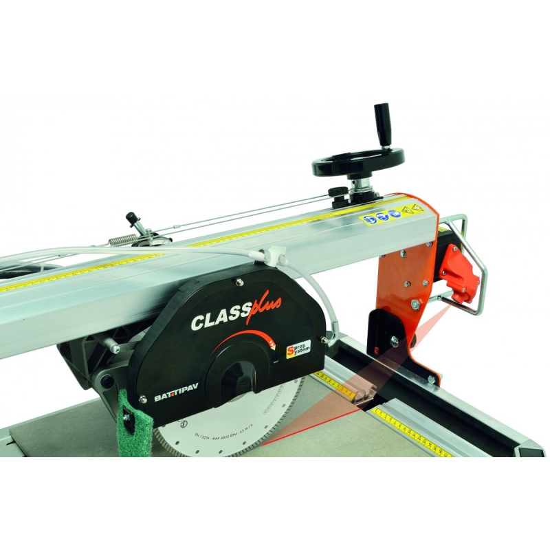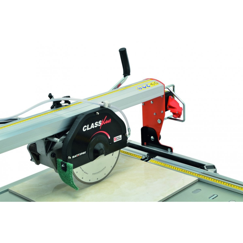 Class Plus 1300 BATTIPAV е професионална електрическа машина за рязане на плочки, предназначена за прецизни прави и ъглови разрези на керамични плочки, гранитогрес, мрамор и други подобни материали. Оборудвана с мощен 1.4 kW мотор и специализиран диамантен диск с диаметър 250 мм, тя гарантира висока производителност и дълъг живот на инструмента дори при тежки натоварвания. Машината разполага с плъзгаща се и накланяща се работна глава, което позволява гъвкавост при изработката на различни видове срезове, включително сложни профили и "джоли" (вълнообразни срезове). Интегрираната лазерна система осигурява максимална точност и улеснява позиционирането на материала, а водното охлаждане удължава живота на диска и подобрява качеството на рязане.