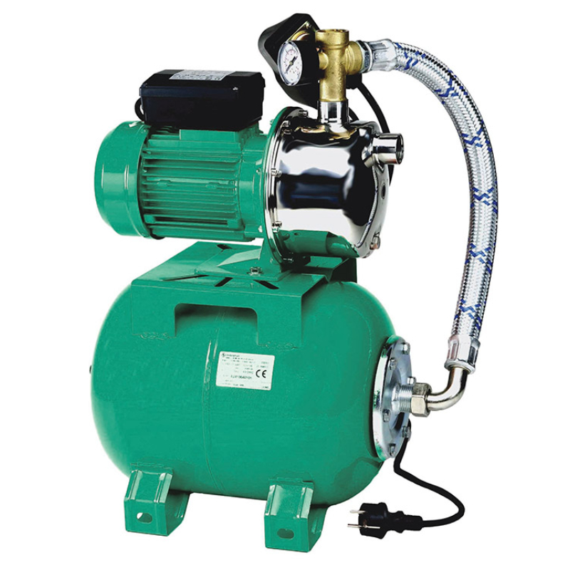 Хидрофорната система Wilo HWJ 203 X EM 24 L е високоефективно и компактно решение за автоматизирано водоснабдяване от кладенци, резервоари и други източници на чиста или дъждовна вода. Тя е съставена от самозасмукваща едностъпална джет помпа, 24-литров хидрофорен съд и управляващ блок с пресостат и манометър, което я прави напълно готова за монтаж и експлоатация. Снабдена е с мощен 1000-ватов електромотор с термична защита и кондензатор, осигуряващ дълъг живот и надеждна работа при ежедневна употреба. Всички части в контакт с водата са устойчиви на корозия, а компактният дизайн позволява инсталация в ограничени пространства.