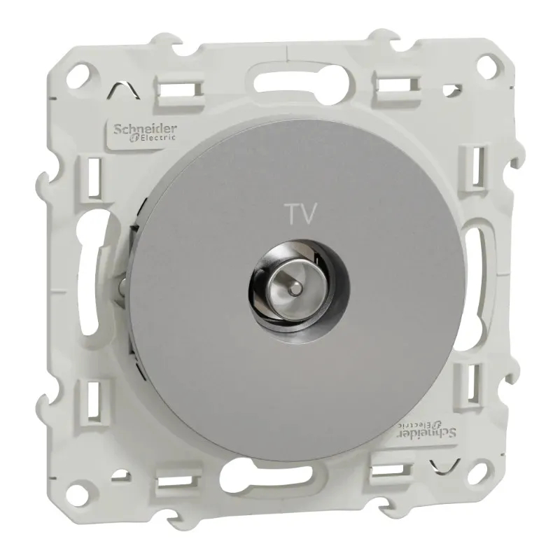 Телевизионна коаксиална розетка от серия Odace на SCHNEIDER ELECTRIC, предназначена за скрит монтаж чрез вграждане в конзола. Оборудвана с 1 мъжки IEC конектор (9.52 мм) и затихване 1.5 dB. Подходяща за изграждане на ТВ инсталации. Изработена от термопластичен ABS-UV стабилизиран материал, със степен на защита IP21. Без декоративна рамка - съвместима с рамки от серия Odace. Размери: 71 x 71 x 28 мм. Цвят: алуминий.