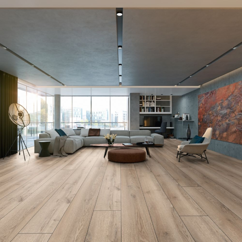 Ламинираният паркет Планински Дъб Крем е изключителна подова настилка, която впечатлява с естествена красота и изискана визия. Балансираната игра на цветове - от светлобежово до кремаво бяло - създава усещане за спокойствие и хармония във всеки интериор. Фината текстура и деликатният релеф пресъздават изцяло визията на истински дъб, а включванията на смола и възли подчертават автентичния му характер.