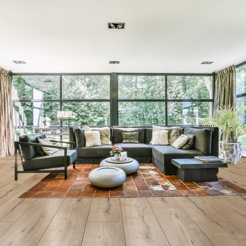 Широката ламела и 4-странната V-фаска подчертават естествената визия на дървото и придават луксозен, премиум вид на всяко помещение.