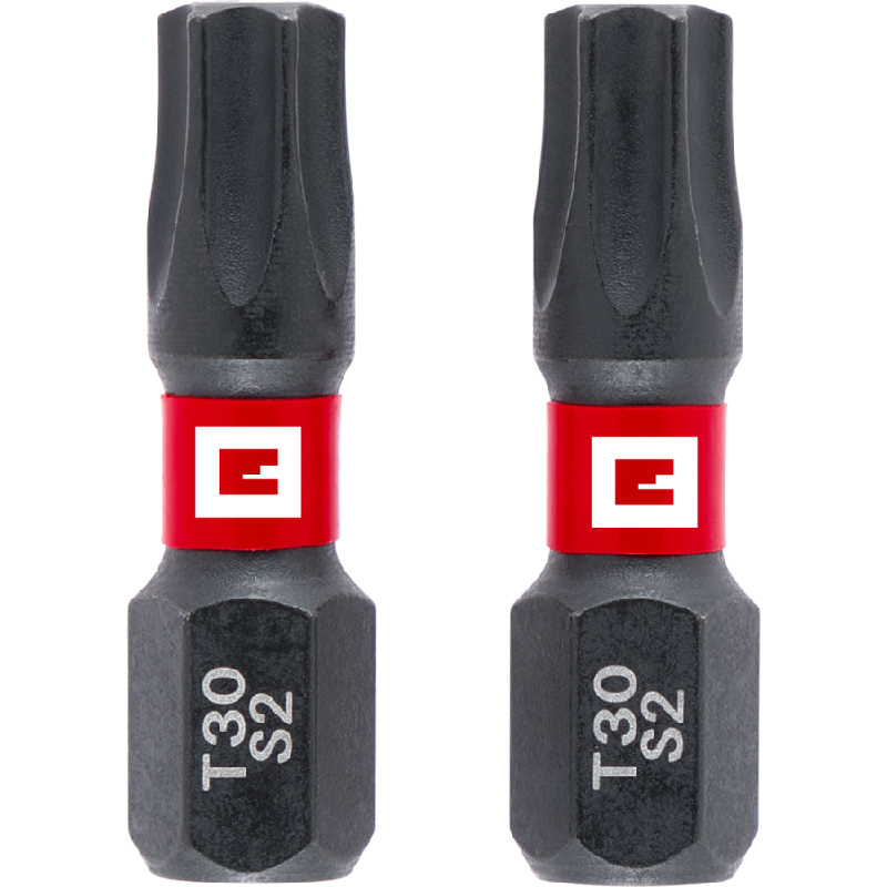 Комплект от 2 броя ударни битове Torx T30 с дължина 25 мм, предназначени за работа с винтове с шестостенно гнездо. Изработени от висококачествена инструментална стомана, битовете осигуряват изключителна здравина и устойчивост при продължителна и интензивна употреба. Специалната торсионна зона ефективно абсорбира натоварванията при ударни приложения, което удължава живота на инструмента и осигурява по-голяма сигурност по време на работа. Универсалният 1/4-инчов захват (тип C 6.3) позволява съвместимост с всички стандартни акумулаторни отвертки и ударни бормашини.