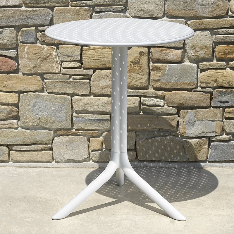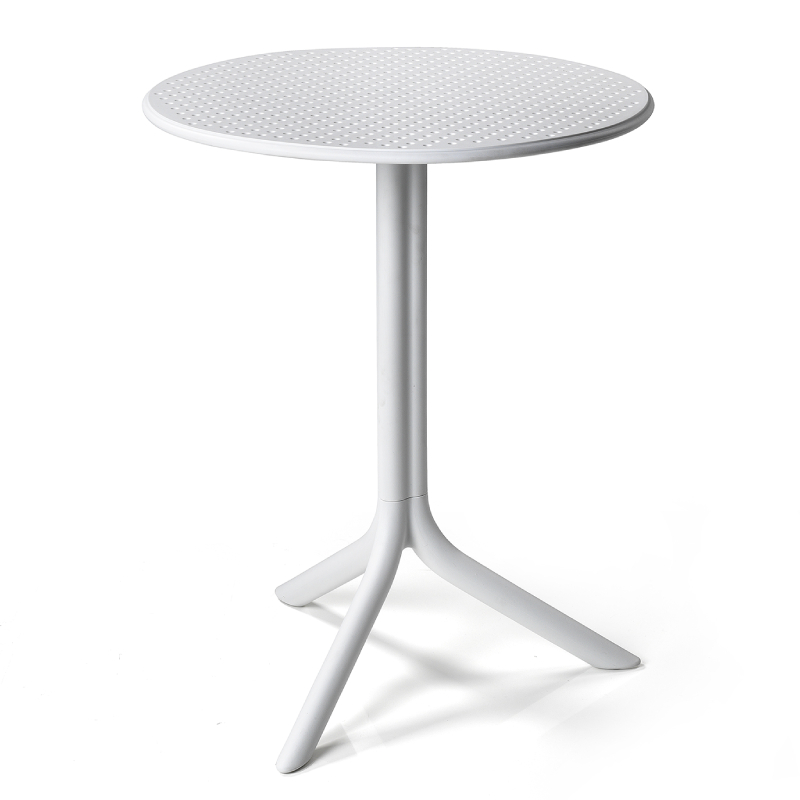Градински кръгла маса Step Bianco на марката NARDI. Диаметър: ф60.5 см. С централна колона и 3 крака. Материал: равномерно оцветени фибростъклени полипропиленови смоли с UV добавки. Разглобяема. Опция за двойна височина: 40 см/76.5 см.