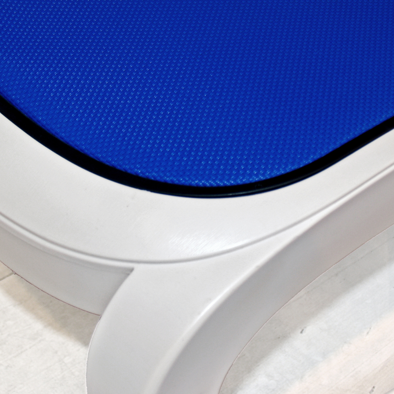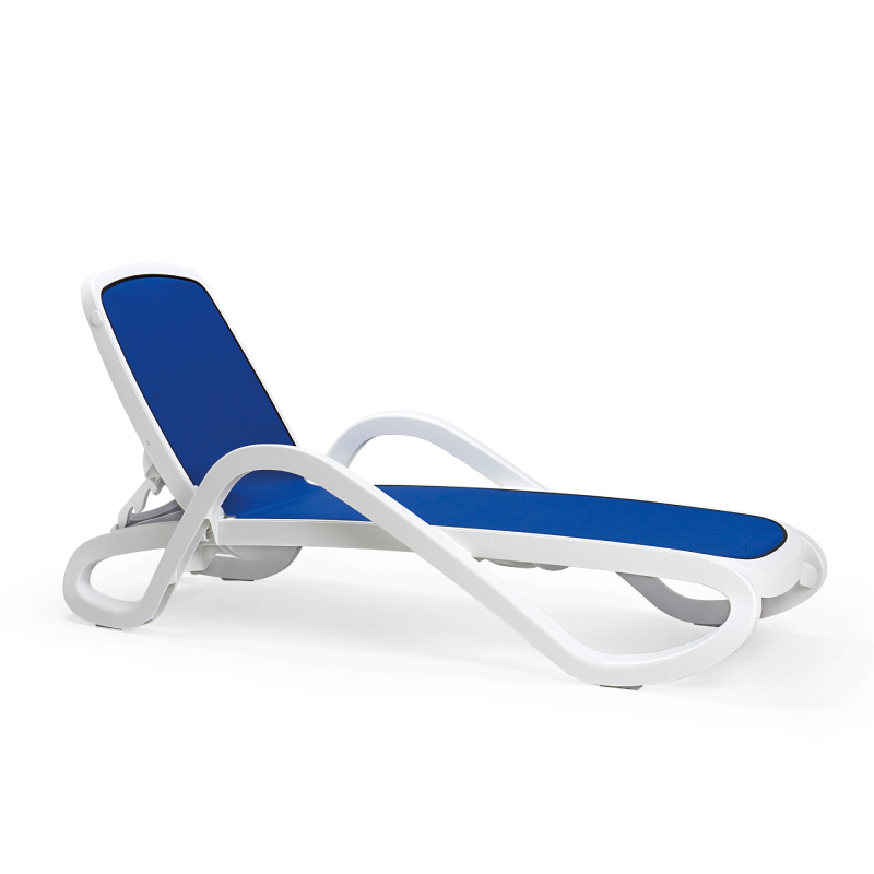 Шезлонг Alfa на марката NARDI. С подлакътници. С рамка от PVC в цвят бял и лежанка от дишаща синтетична мрежеста тъкан (подменяема) в цвят син.
