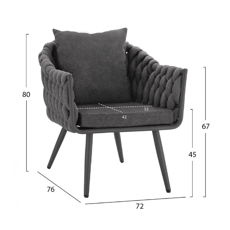Изработени от висококачествени материали, металната рамка и текстилът са специално подбрани за дълготрайна употреба на открито, благодарение на устойчивостта си на екстремни температури и UV защита. Това гарантира, че комплектът ще запази свежия си външен вид и удобство дори при променливи климатични условия. Независимо дали искате да релаксирате с книга на верандата, или да се насладите на приятни вечери с приятели, този градински комплект е идеалният избор за комфорт и стил.