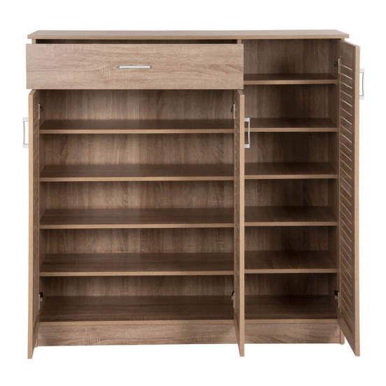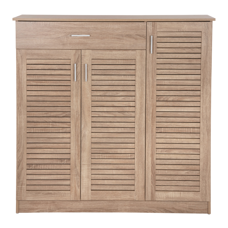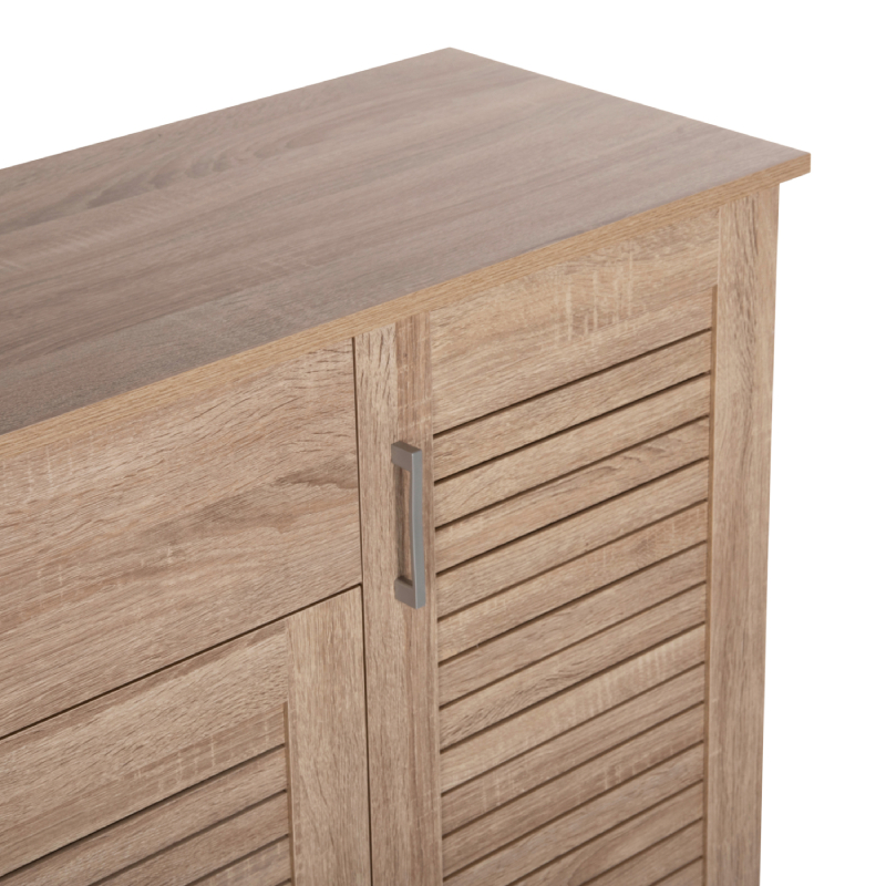 Неговият изчистен дизайн с модерни метални дръжки и врати с отвори за вентилация не само поддържат обувките добре проветрени, но и внасят усещане за лекота и ред. Благодарение на многото рафтове и вградено чекмедже, можете да съхранявате всичко - от обувки и чанти до аксесоари и домакински принадлежности.