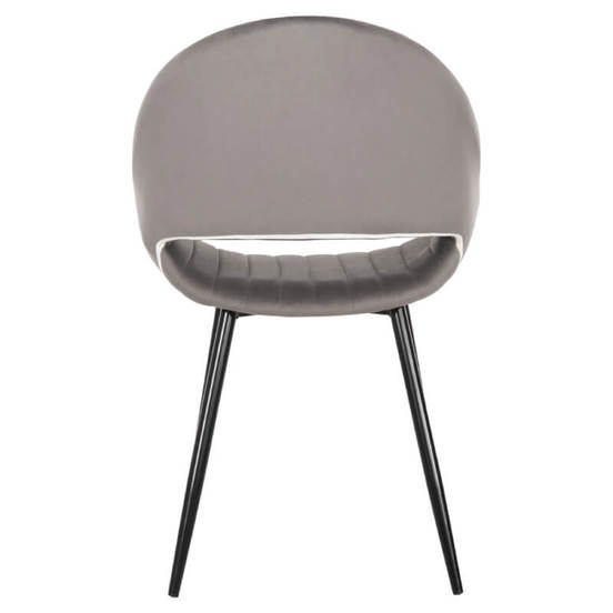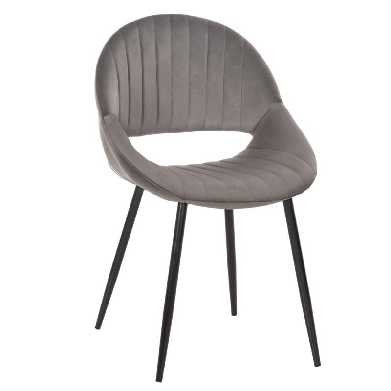 Благодарение на меката сива тапицерия от висококачествено кадифе и металните крака в черно, столът излъчва фина естетика и придава усещане за уют и класа. Облегалката е декорирана с капиотен (декоративен) ефект, който допълва луксозното излъчване на модела. Компактният му размер и вниманието към детайла го правят не просто функционална мебел, а и стилен акцент.