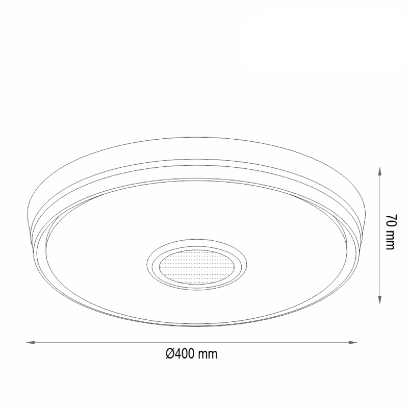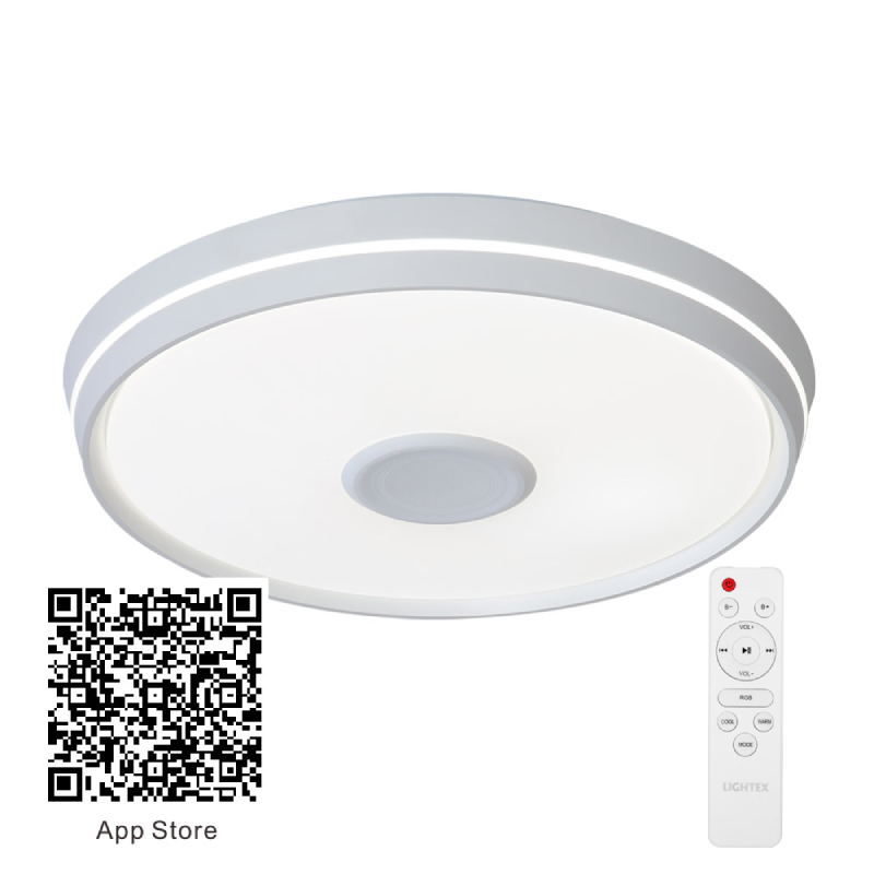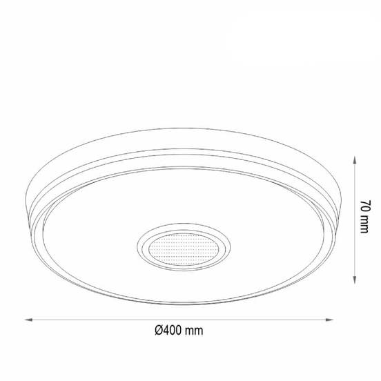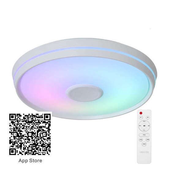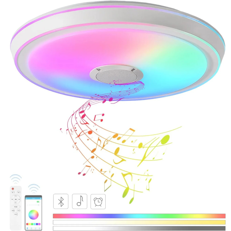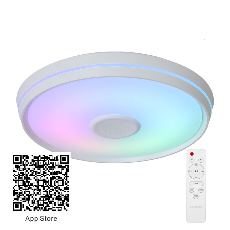 Плафон с дистанционно 50 W 4000 lm RGB 3000-4000-6500 K Music+Bluetooth ⌀400 мм. Този интелигентен LED плафон съчетава мощно осветление с музикална функция, като създава перфектната атмосфера за всяко пространство. С възможност за регулиране на цветната температура (3CCT: 3000 K/4000 K/6000 K) и RGB подсветка, той предоставя разнообразие от над 100 различни сцени на осветление.