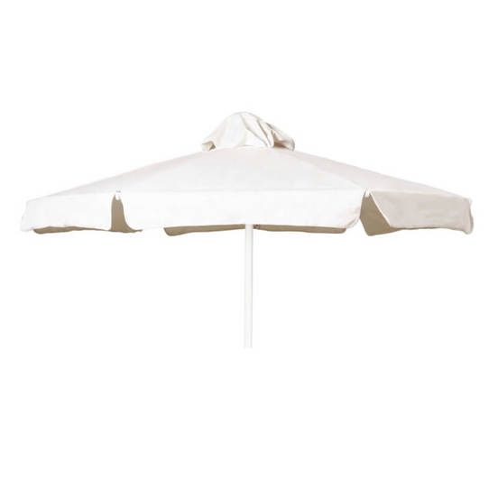 Плажен чадър. Чадърът е с диаметър 2.20 м и е в цвят бял. С алуминиева основа.
