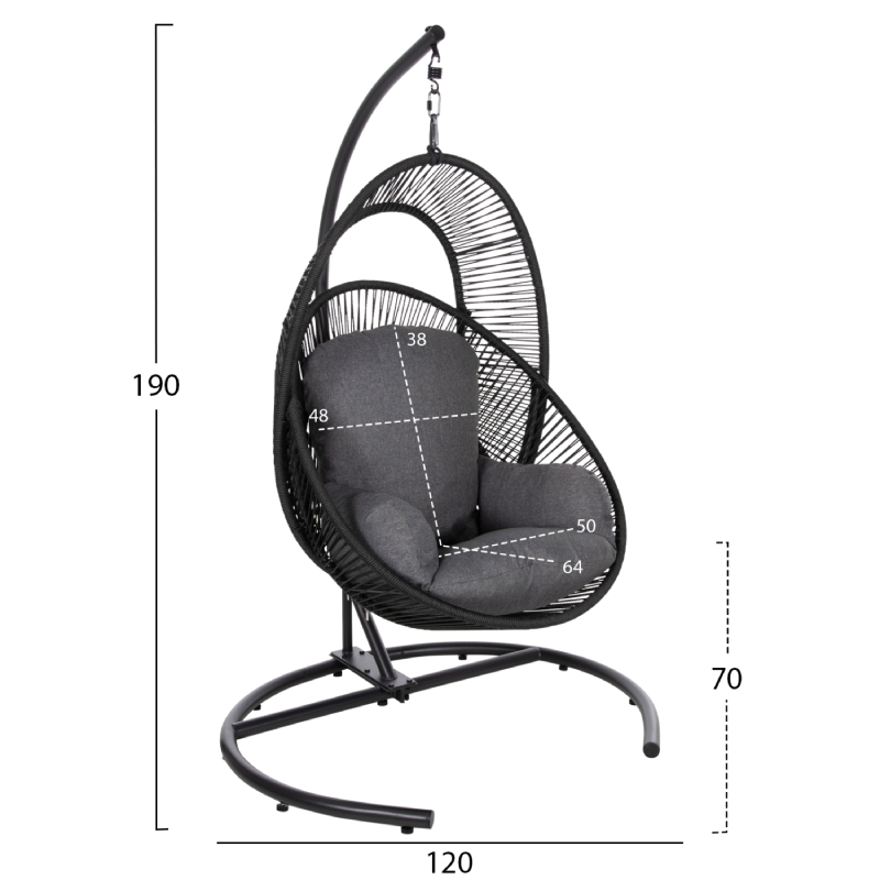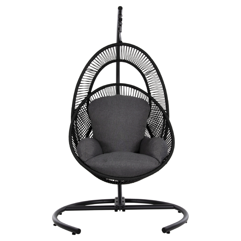 Градинска люлка тип гнездо Ruler. Едноместна. Разполага със здрава метална конструкция в цвят черен и рамка с ергономична яйцевидна форма. Изработена е от синтетичен ратан в цвят черен и има две меки възглавнички в цвят сив, които осигуряват допълнително комфорт и уют. Възглавниците имат връзки за завързване към гнездото и регулиране на височината, която ви подхожда.
