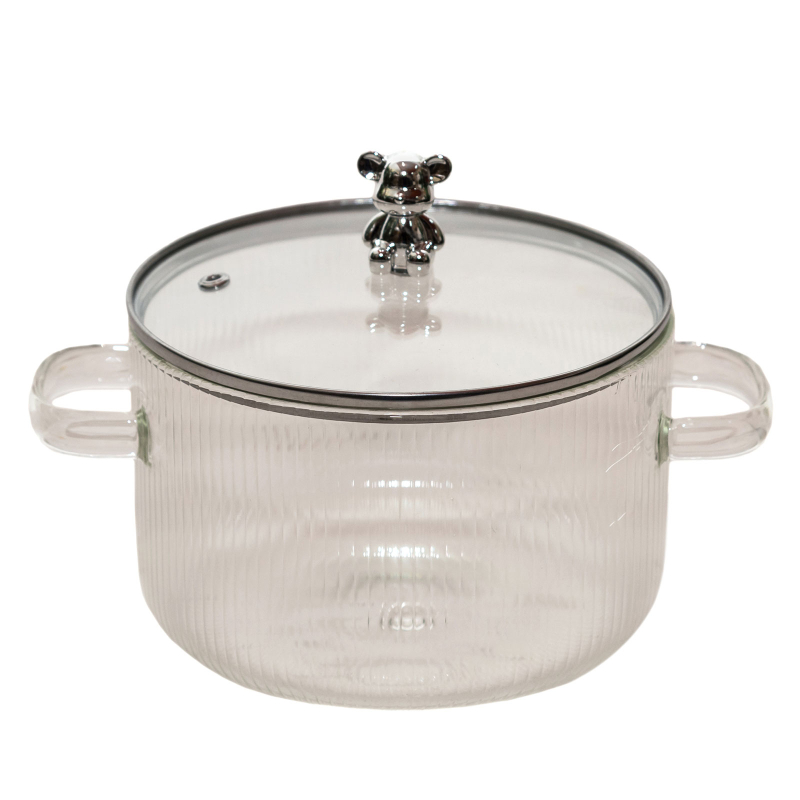 Добавете елегантност и функционалност към кухнята си с тази прозрачна стъклена тенджера с капак и удобни странични дръжки. Предлага се в два стилни цвята - златен и сребърен, за да пасне на различни вкусове и интериори.