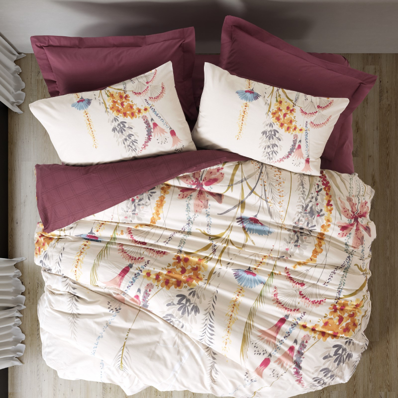 Комплектът Flas се поддържа изключително лесно - просто го изперете на 30°C в обърнато положение, за да съхраните цветовете и формата. Не се препоръчва използването на избелващи препарати. Памукът е естествен материал, който не задържа алергени и е подходящ за чувствителна кожа. Дизайнът на комплекта Flas съчетава изчистена естетика и практичност, което го прави подходящ за всякакъв тип интериор - от минималистични спални до класически обзаведени помещения. Цветовете и десените са внимателно подбрани, така че да създават усещане за спокойствие и уют, без да доминират визуално в стаята.