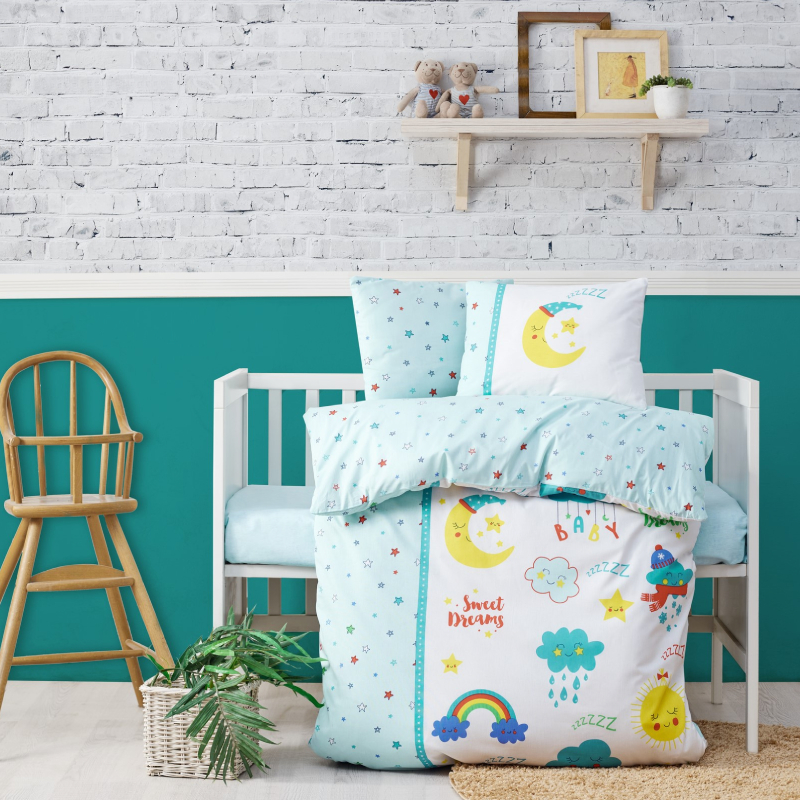 Дизайнът на комплекта е съобразен не само с практичността, но и с естетиката - нежните десени и свежите цветове допринасят за спокойната атмосфера в бебешката стая. Без прекалено ярки тонове или дразнещи елементи, текстилът създава усещане за уют и сигурност, от които всяко бебе се нуждае.