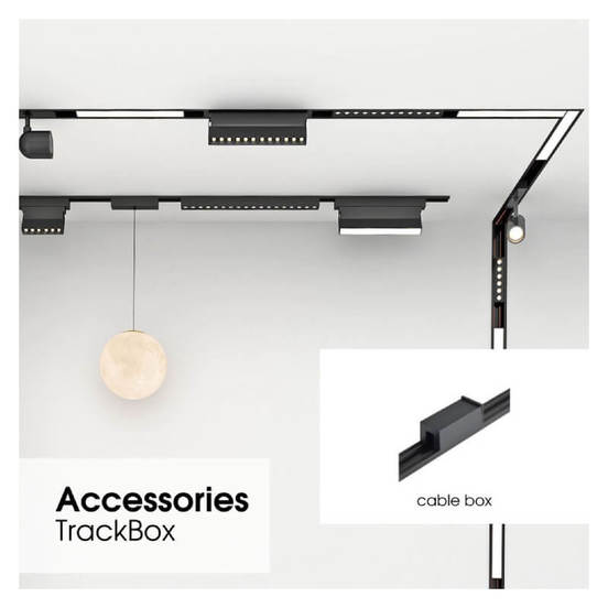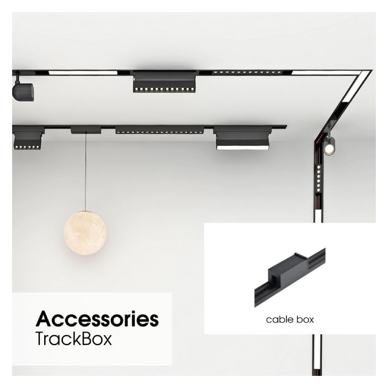 TrackBox е елемент от серията SLIM25, проектиран за елегантно и безопасно прикриване на свързващи елементи и лустер клеми при инсталация на магнитни релсови системи. Изработен от висококачествен PC материал, TrackBox осигурява завършен и дискретен вид на свързванията, запазвайки естетиката на осветителната конфигурация.