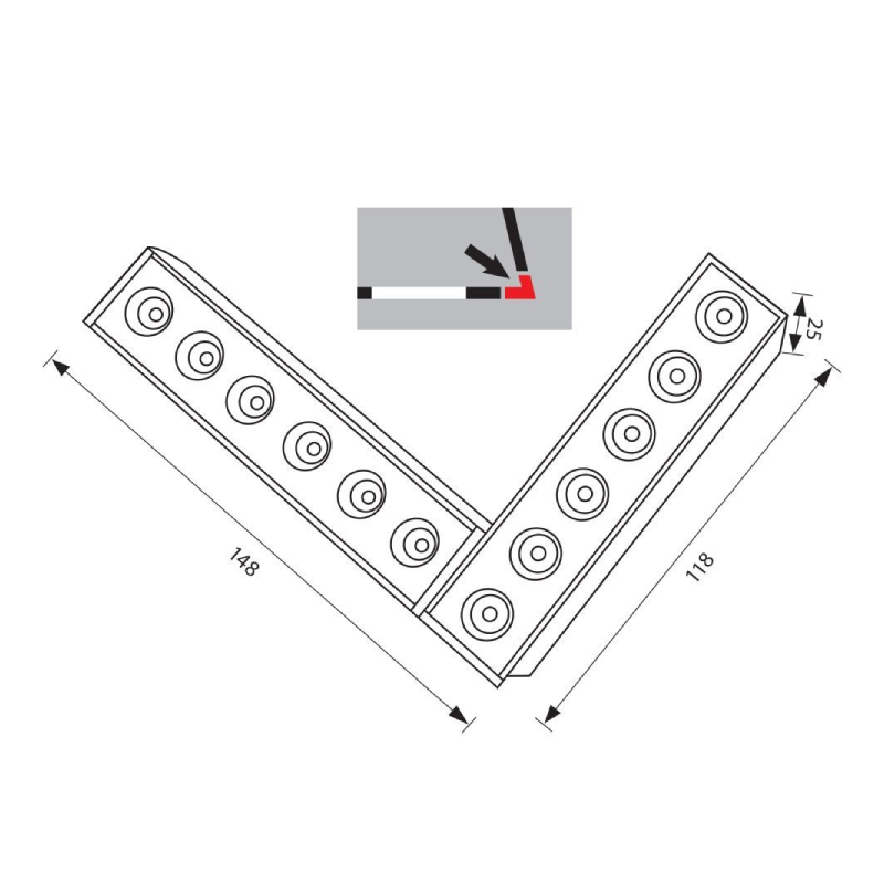 LEMINI LED 12 W е елегантно L-образно магнитно LED осветително тяло от серията SLIM25, проектирано за 48 V релсови системи. С компактна форма и насочен светлинен поток, то е идеално за монтаж в ъгли, придавайки акцентно осветление с топла светлина (3000 K).