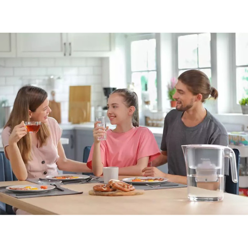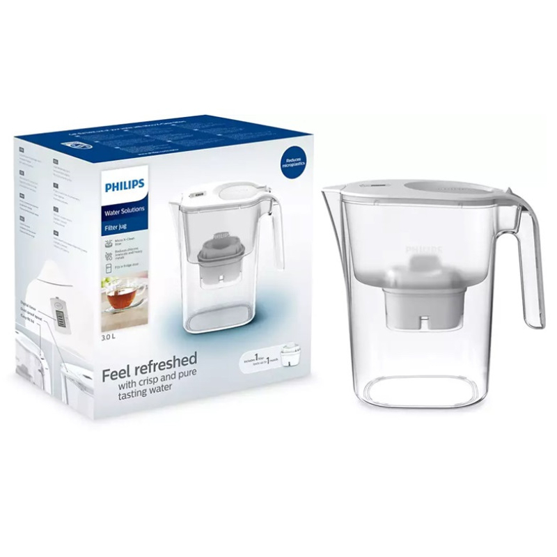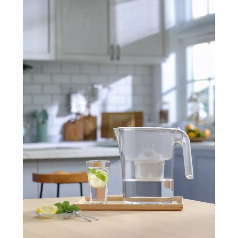 Филтърната кана за вода PHILIPS AWP2936WHT е идеалното решение за всеки дом, който иска да се наслаждава на чиста и свежа питейна вода без излишни химикали и замърсители. С капацитет от 3 литра и възможност за филтриране на 1.9 литра вода, тази кана комбинира удобство и функционалност, като се побира лесно във вратата на хладилника, осигурявайки ви винаги студена и пречистена вода под ръка. Благодарение на висококачествения филтър Philips Micro X-Clean, който намалява хлора, варовика, тежките метали, микропластмасите и други вредни вещества, можете да сте спокойни, че консумирате вода с високо качество и приятен вкус.