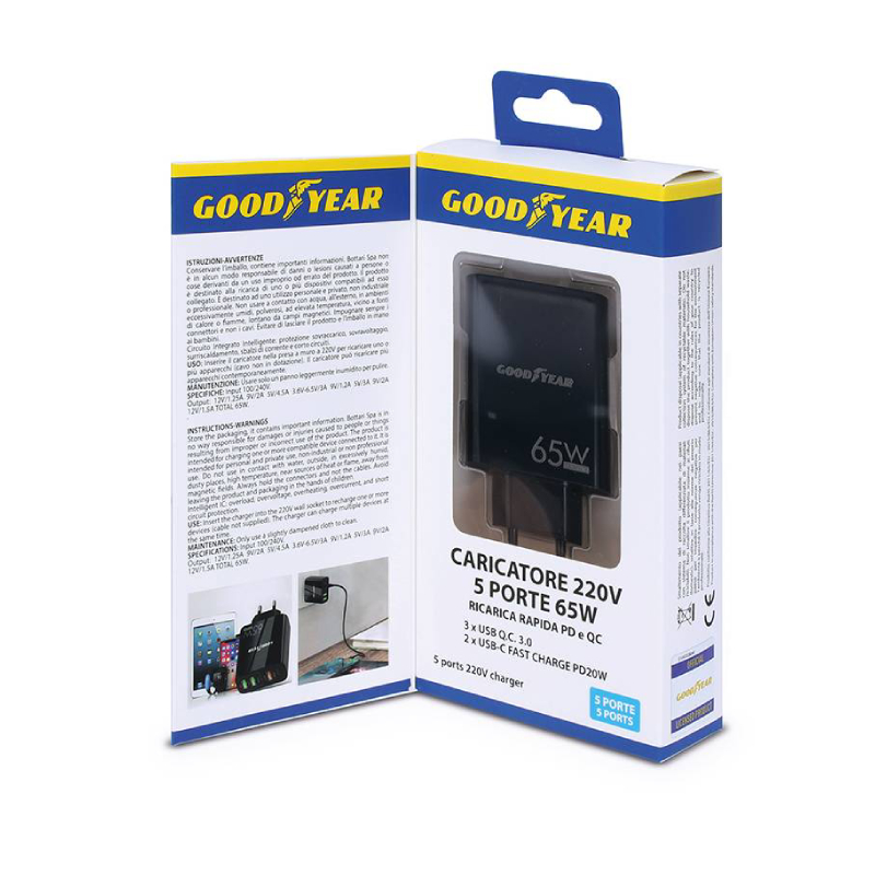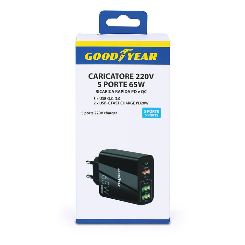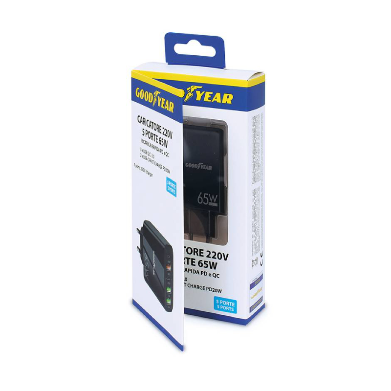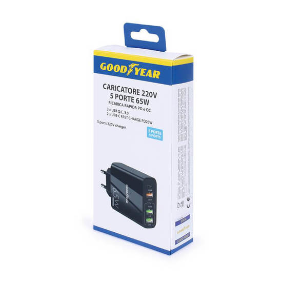 Зарядното устройство Goodyear 65 W с пет порта е перфектното решение за всеки, който има нужда да зарежда няколко електронни устройства едновременно и с висока скорост. Оборудвано с три USB 3.0 Quick Charge 3.0 порта и два USB-C Fast Charge порта, то осигурява мощност до 65 вата, което позволява бързо и ефективно зареждане на смартфони, таблети, лаптопи и други USB устройства. Компактният му дизайн го прави удобен за използване както вкъщи, така и в офиса или при пътуване, като същевременно предлага универсална съвместимост с електрически мрежи от 100 до 240 волта.