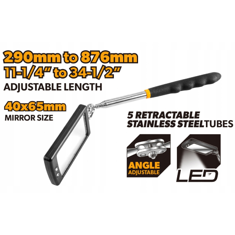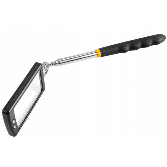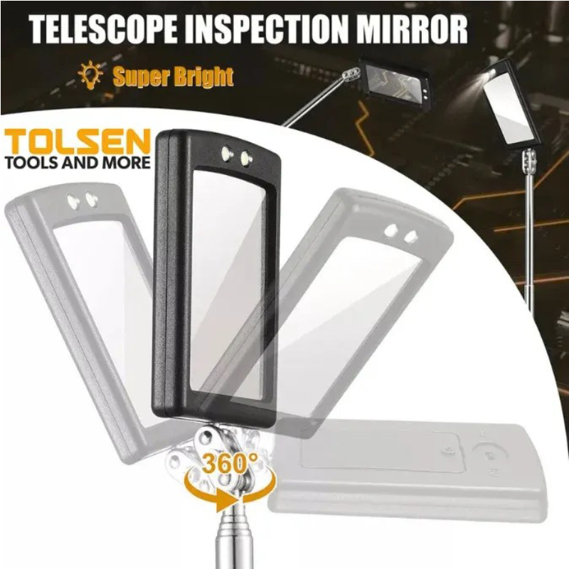 Контролното огледало с LED осветление TOLSEN е специализиран инструмент, предназначен за лесна инспекция на труднодостъпни зони в автомобила, машината или работния цех. Благодарение на телескопичната си функция с дължина, регулируема от 290 до 876 мм, то позволява бърз достъп до скрити места като двигатели, тръбопроводи и други тесни пространства. Вграденото LED осветление осигурява ясна видимост дори при слабо осветление, което улеснява откриването на дефекти, замърсявания или други проблеми.