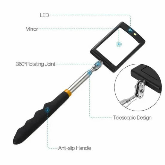 Изработено от неръждаема стомана с лека конструкция, огледалото е устойчиво на корозия и механични повреди, а противохлъзгащата ергономична дръжка гарантира комфорт и сигурност при работа. Този професионален инструмент е незаменим помощник за автомобилни техници, механици, монтажници и всеки, който се нуждае от прецизна визуална проверка на труднодостъпни места.