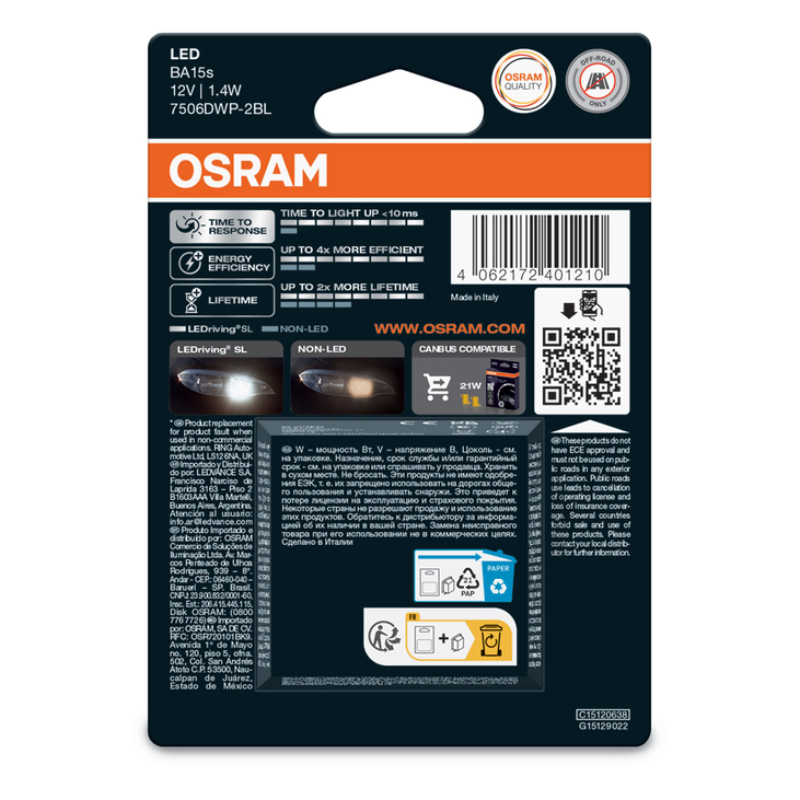 Открийте новото поколение автомобилно осветление с LED лампата OSRAM 7506DWP-02B P21W - съвършената комбинация от иновация, надеждност и модерен дизайн. Тази диодна крушка е проектирана да предложи по-добра осветеност, по-нисък разход на енергия и значително по-дълъг експлоатационен живот в сравнение с традиционните халогенни лампи. С нея не просто подменяте източника на светлина - подобрявате видимостта на пътя и допринасяте за по-безопасно шофиране при всякакви условия.