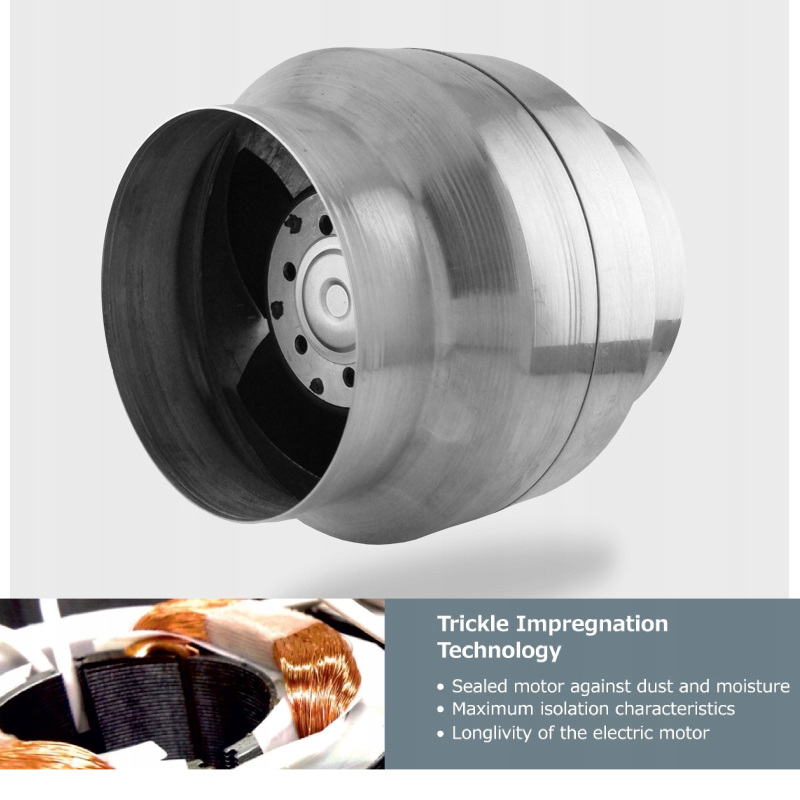 Вентилаторът е оборудван с тих двустепенен мотор с японски NSK лагери за дълготрайна работа и минимален шум (51 dB). Степента на защита IP44 го прави подходящ за работа в среди с висока влажност. Монтажът е свободен по ориентация, а управлението може да се осъществява чрез отделен ключ или тиристорен регулатор на оборотите. Уредът е произведен в ЕС и отговаря на високите стандарти за качество.