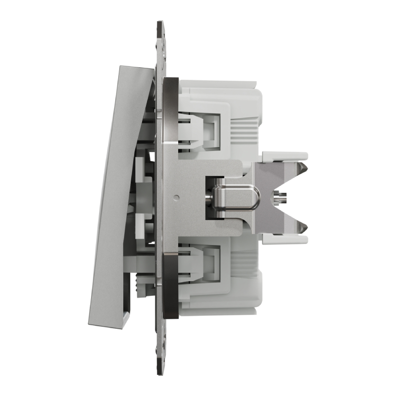 Междинен (кръстат) ключ Asfora в стилен алуминиев нюанс - изключително решение за управление на осветление от три или повече места. Практичен монтаж с безвинтови клеми и здрав корпус.