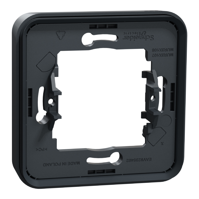 Единична декоративна рамка от серията Mureva Styl на Schneider Electric, предназначена за хоризонтален монтаж и съвместима с ключове и контакти от същата серия. Изработена от устойчив поликарбонат (PC), с компактни размери 44 x 84 x 84 мм и модерен антрацитен цвят (RAL 7016). Подходяща за използване в среди с по-високи изисквания към здравината и дизайна.