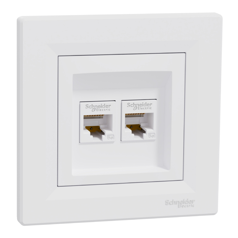 Двупортова комуникационна розетка от серията Asfora на Schneider Electric, подходяща за изграждане на структурни кабелни системи у дома или в офиса. Осигурява надеждна връзка за предаване на данни чрез неекранирани (UTP) кабели, категория Cat5e.