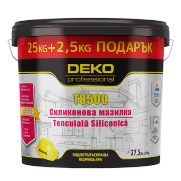 Силиконова влачена мазилка Deko Professional Т8500. Едрина на зърното: 2 мм. Цвят: бял. Влачената мазилка е декоративно защитно покритие със силикон за стени за интериорна или екстериорна употреба.