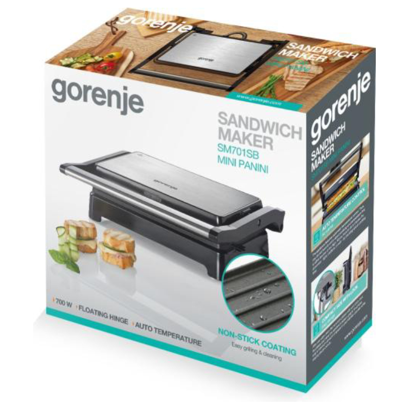Сандвич мейкърът Gorenje SM701SB е създаден за лесно и бързо приготвяне на вкусни сандвичи, тостове и гриловани ястия. Благодарение на незалепващото покритие на алуминиевите плочи, храната не се залепва и се приготвя равномерно, а почистването след употреба е изключително бързо и удобно. С мощност от 700 W и компактни размери устройството е подходящо за ежедневна употреба, позволявайки приготвянето на закуска, обяд или лека вечеря без излишни усилия.