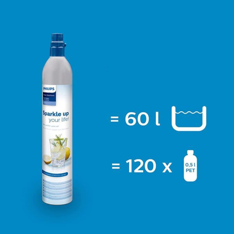 Philips ADD913/10 е надежден и практичен CO₂ цилиндър, създаден специално за съвместимост с машините за газирана вода Philips GoZero, който ви осигурява удобството да приготвяте газирана вода у дома по всяко време. С вместимост от 425 г CO₂ един цилиндър е достатъчен за приготвянето на до 60 литра газирана вода, което означава, че замества приблизително 120 пластмасови бутилки за еднократна употреба. Така не само пестите средства и време, но и допринасяте за опазването на околната среда чрез намаляване на отпадъците.