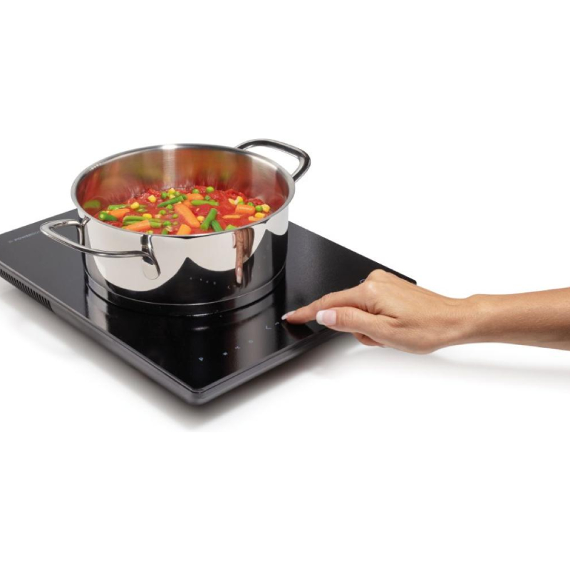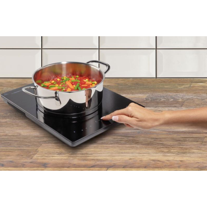 Освен високата ефективност, котлонът е проектиран с мисъл за безопасността и удобството на потребителя. Детската защита и автоматичното изключване при премахване на съд от котлона осигуряват спокойствие при ежедневна употреба. Устройството предлага 10 нива на мощност и температурни настройки от 60 до 240°C, позволявайки прецизно следване на рецепти. Компактният му размер и ниската височина от 42 мм го правят идеален за малки кухни или като преносим уред за допълнително готвене.