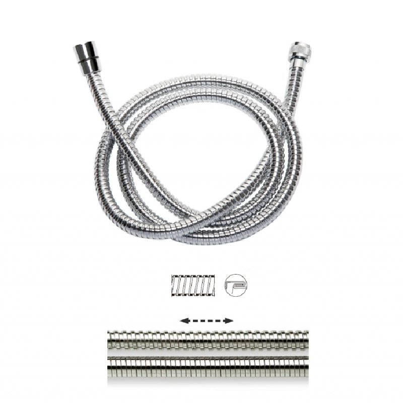 Практичен и здрав шлаух за ръчен душ, подходящ за всяка баня. Изработен с двойна оплетка от неръждаема стомана и вътрешен PVC маркуч, той осигурява изключителна издръжливост и гъвкавост при употреба. Дизайнът му с разтегателна дължина от 175 до 225 см позволява лесно адаптиране към различни душ системи. Шлаухът е с хромирано покритие и устойчивост на опън до 50 кг, гарантиращо безопасна и дълготрайна употреба.