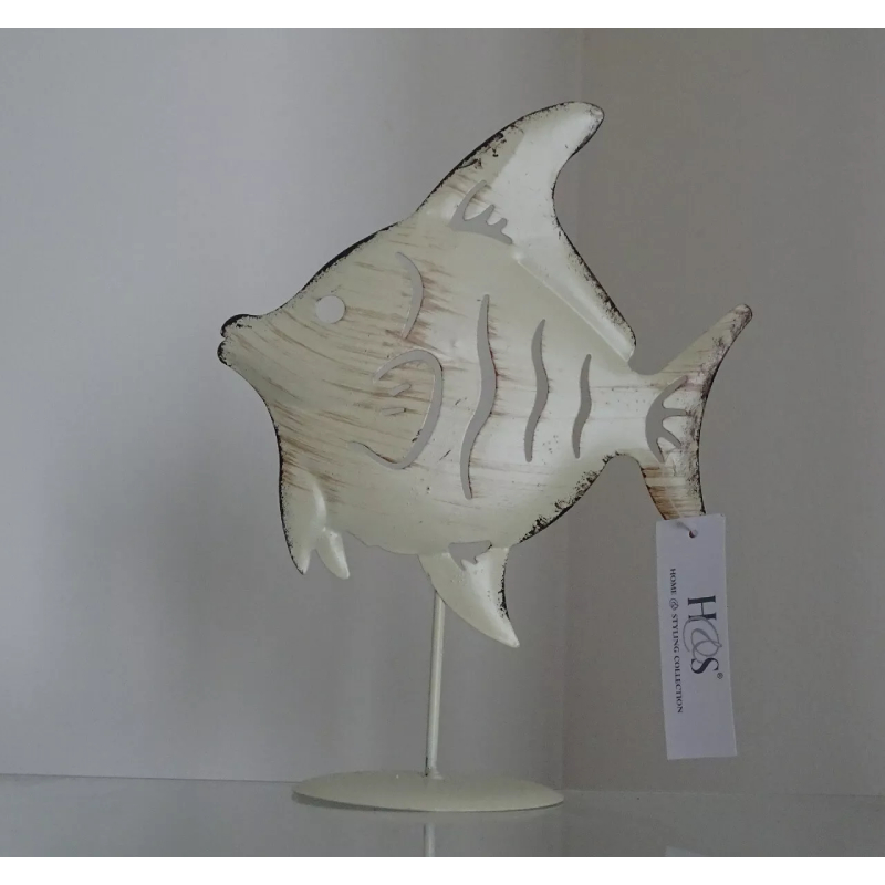 Семплата кремава окраска и детайлната форма на рибата придават изтънченост и визуален интерес на всяка повърхност, върху която се постави. Тази декоративна фигура може да бъде комбинирана с други морски елементи или самостоятелно, като създава хармонична атмосфера и добавя уникален акцент в интериора. Отлична е и като малък подарък за любители на морския стил и тематични декорации.