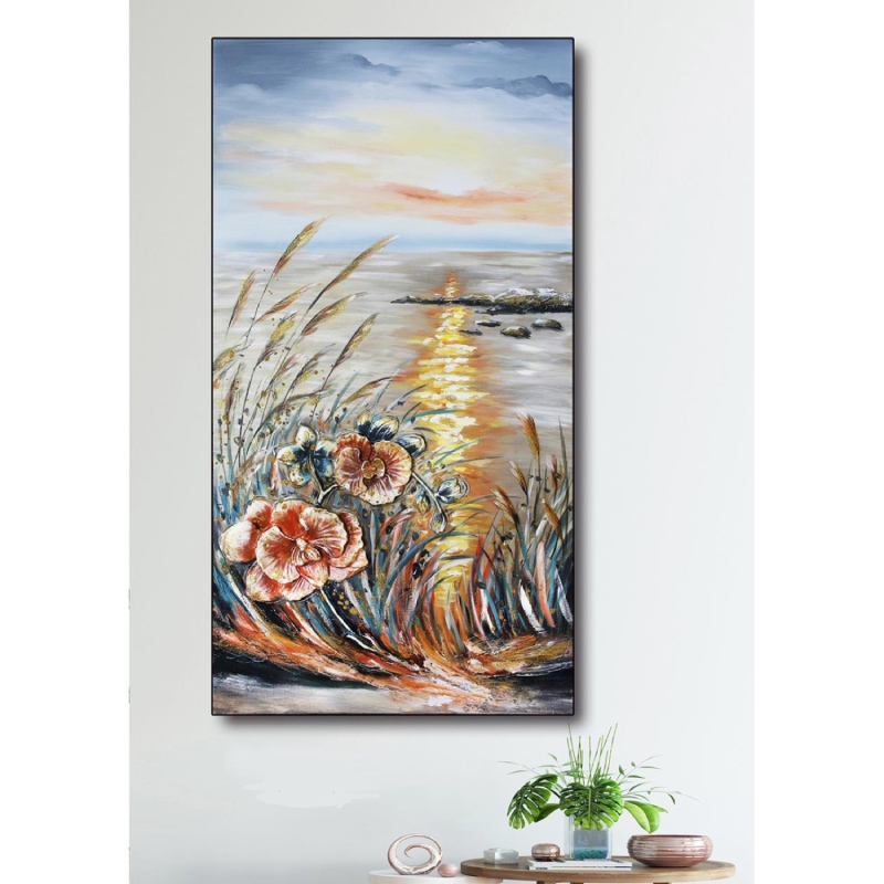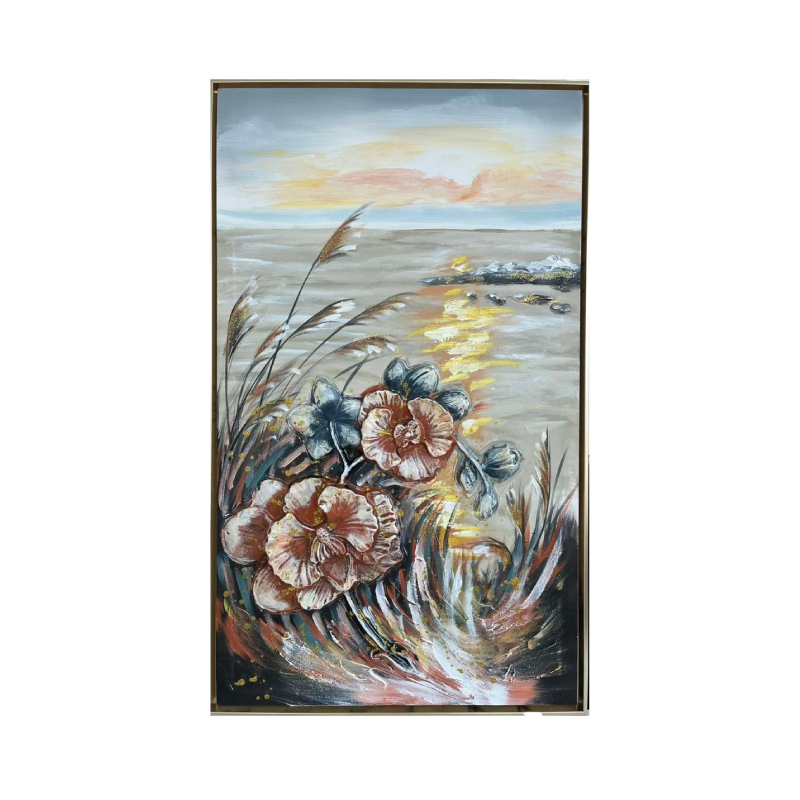 Картината "Зора на цветния бряг" изобразява магически момент от изгрева над морския хоризонт. На преден план са разцъфнали пъстри цветя, които контрастират с нежните тонове на зората. Оранжевите акценти добавят живот и топлина, а в центъра се разкрива пейзаж с плаж, огрян от първите слънчеви лъчи. Небето е обагрено в розово, оранжево и златисто, носейки усещане за спокойствие, хармония и ново начало.