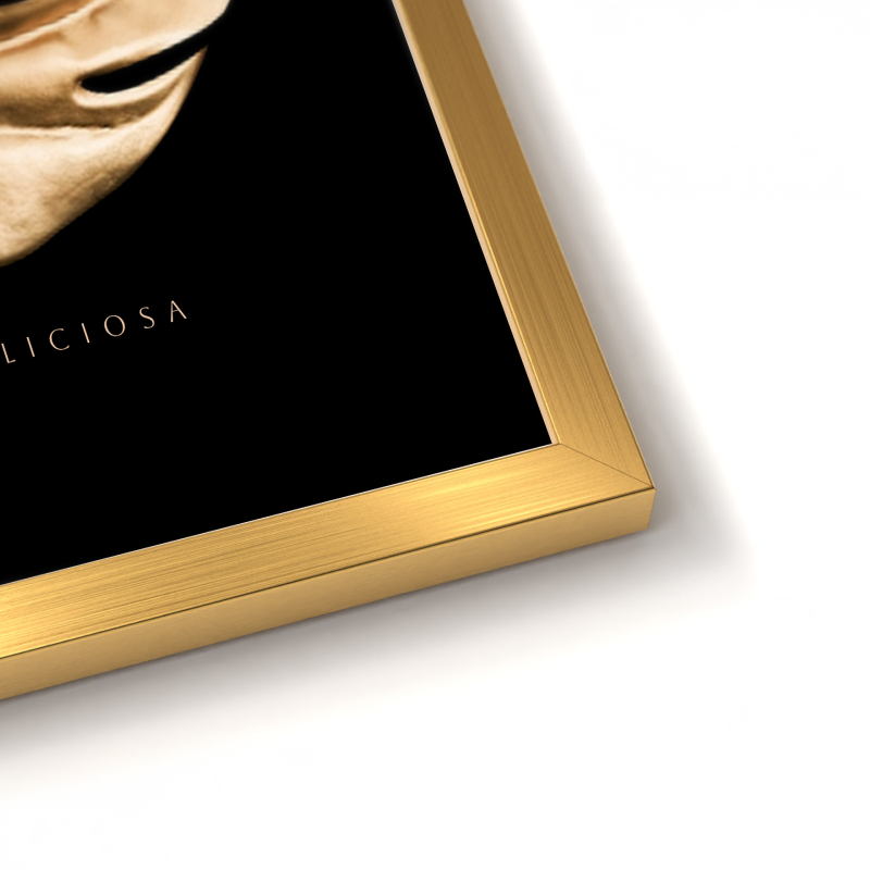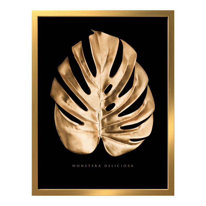 Картината FR504 Златно листо Monstera представя изискано изображение на лист от Монстера деликатесна (Monstera deliciosa), изпълнен в златист металиков ефект върху дълбок черен фон. Контрастът между сияещото листо и тъмната основа придава усещане за лукс, елегантност и съвременен стил, като същевременно добавя екзотичен акцент към интериора.