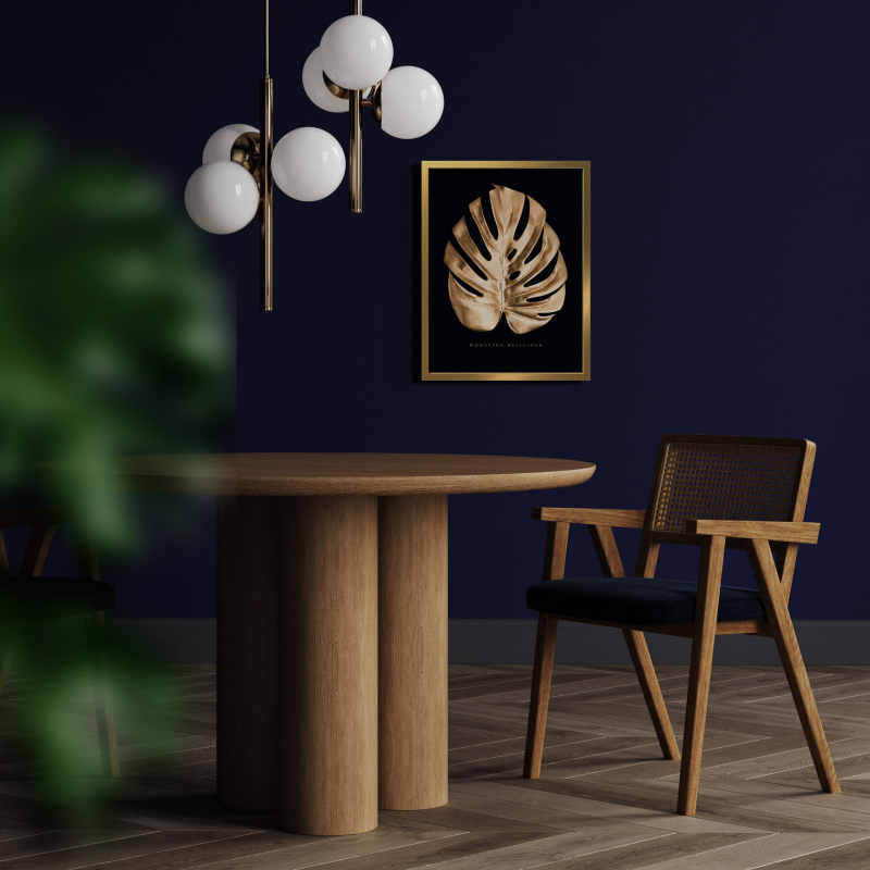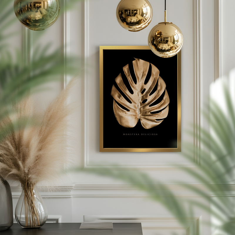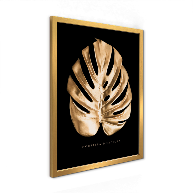 Произведението е поставено в златиста рамка, която подчертава блясъка на листото и придава завършен вид на картината. FR504 Златно листо Monstera е идеална за декорация на стени, където се търси съвременен, стилен и елегантен арт елемент.