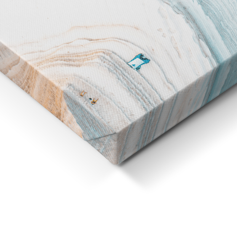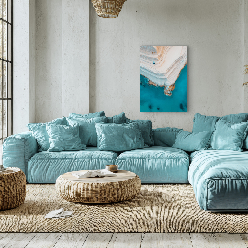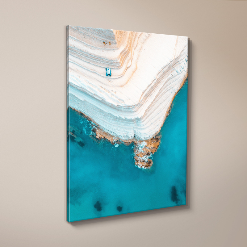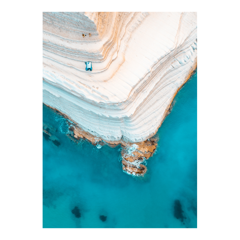 Картината ST844 "Clean Coast" представя впечатляваща въздушна фотография на природен обект от южния бряг на Сицилия, Италия. Изображението показва огромна, извита скала, оформена като естествено стълбище, съставена от бял варовик и мергел. Белотата на скалата контрастира ярко с наситения тюркоазен цвят на морето под нея, създавайки впечатляващ визуален ефект и усещане за чистота и свежест.