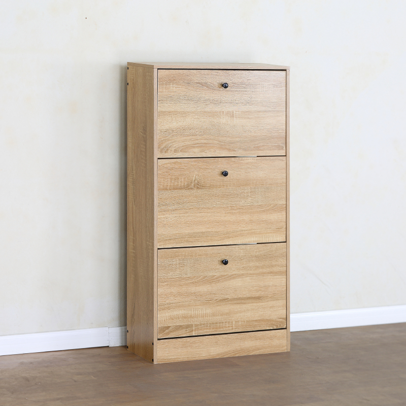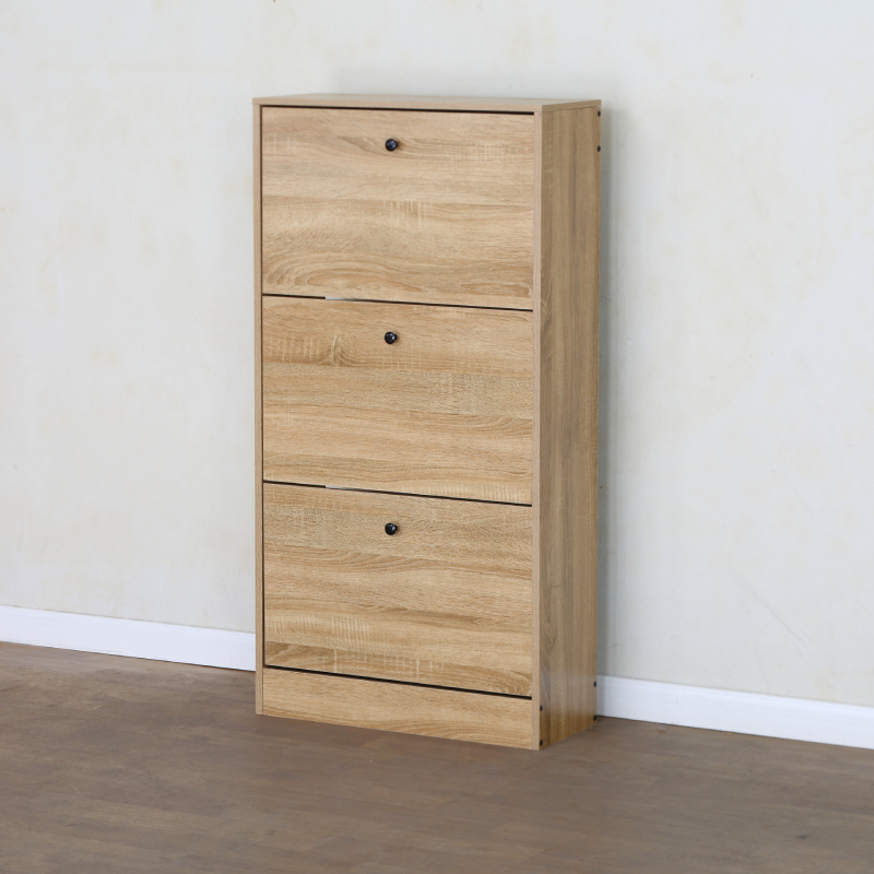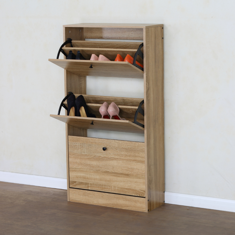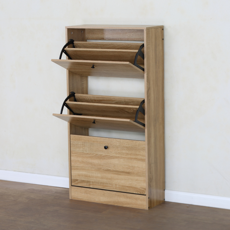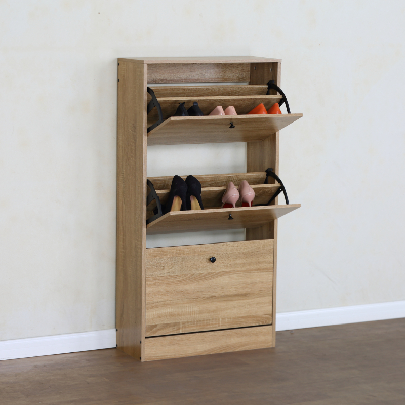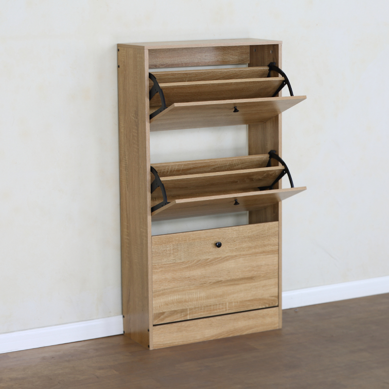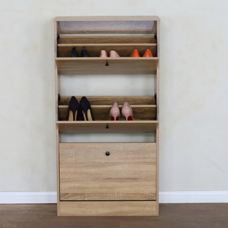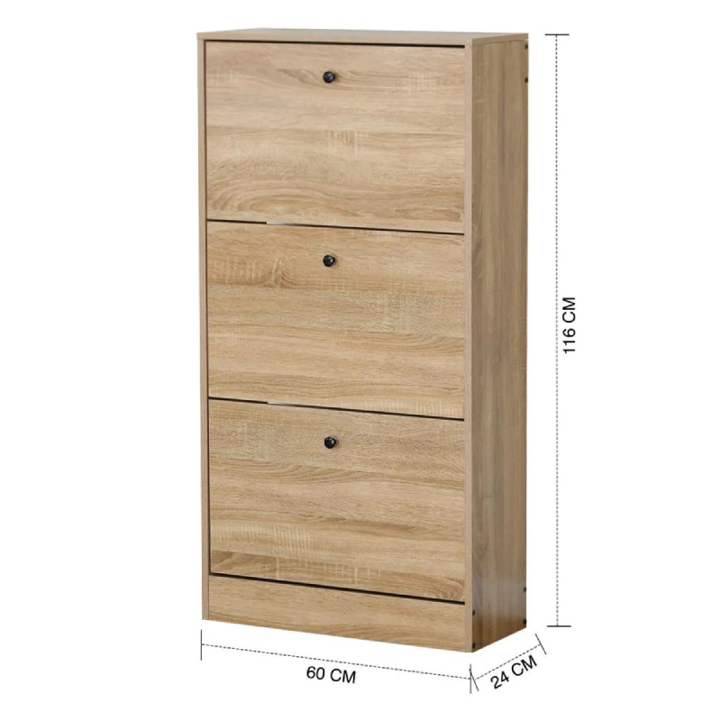 Шкафът разполага с два накланящи се (падащи) рафта, идеални за съхранение на няколко чифта обувки на отделение, което позволява лесен достъп и организиране. Под тях има едно по-голямо чекмедже или шкафче с врата, подходящо за аксесоари като ръкавици, шапки или по-високи обувки и ботуши. Минималистичният дъбов цвят придава елегантност и се вписва хармонично във всеки интериорен стил.